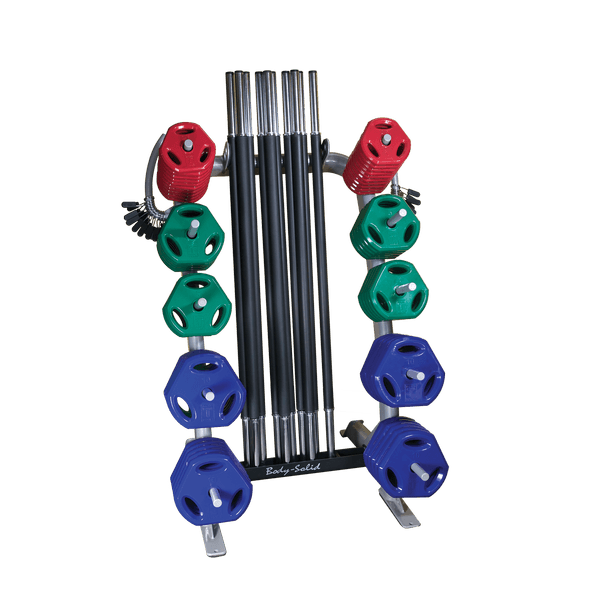 Cardio barbell training is one of the most effective group exercises around. Cardio barbell training combines cardio and strength into coordinated total body movements. Outside of an instructor, the brand new Body Solid Cardio Barbell Set (GCRPACK) is everything any facility needs to offer this popular group class. Body Solid’s Cardio Barbell Set includes the rack and 10 sets of cardio barbells, weights and collars. The compact rack keeps the equipment clean and organized allowing for easy access and weight selection.