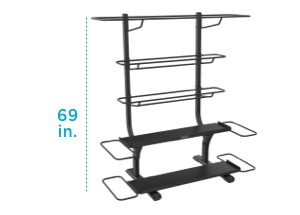 From the top down, this space-efficient Optional Accessories Storage Rack can hold one large yoga ball, one small yoga ball, one Bosu ball, up to four medicine balls or 8 slam balls, and up to 4 foam rollers or rolled mats.