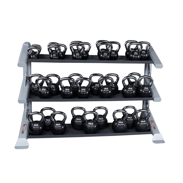 The SDKRKB Kettlebell shelf can hold a variety of KB Kettlebells, KBC Premium Kettlebells, KBL Kettleballs, or KBV Vinyl Kettlebells. The SDKRKB has a surface space of 59″ x 12″. Use the chart below to determine the approximate amount of kettlebells each shelf can hold.